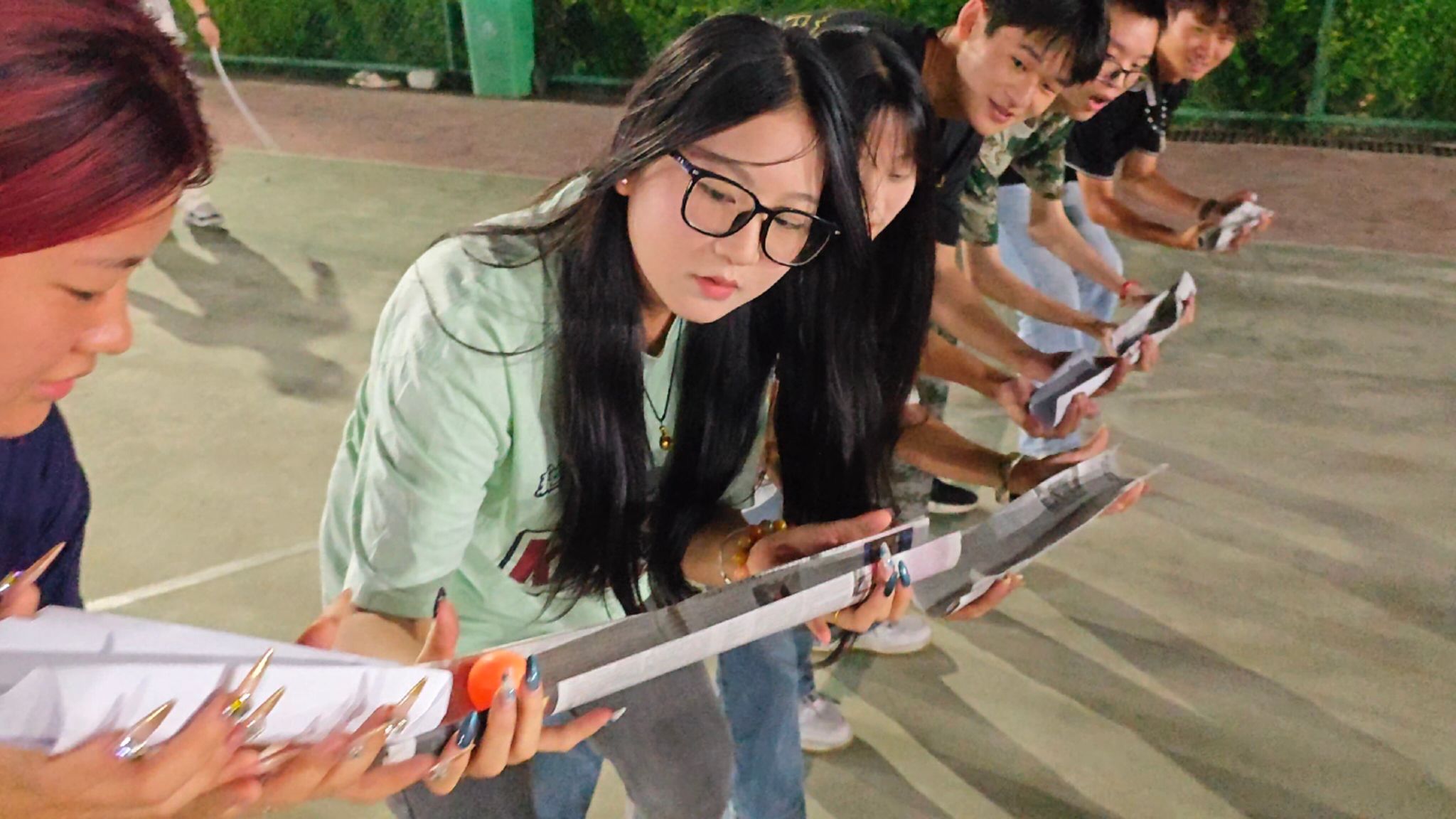 “珠行万里”环节,队员们手持报纸作为球槽,接力传递乒乓球至指定目的地。队员们紧盯球的滚动轨迹,快速衔接并迅速补位到队伍末端,全程专注且高效。过程中,大家不断调整节奏、互相提醒,深刻体会到“每个环节零失误”对团队目标的重要性,有效提升了协作衔接与自我控制能力。