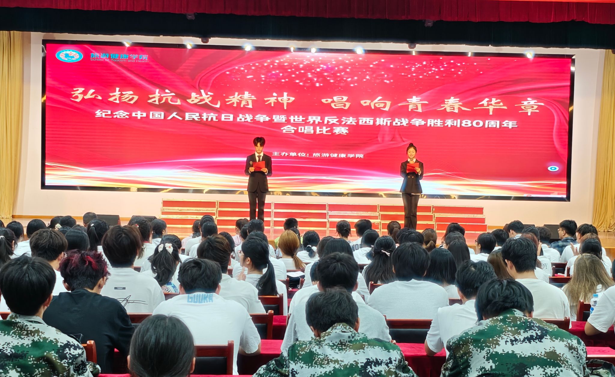 为大力弘扬伟大抗战精神,传承红色基因,凝聚爱国热情,9月29日中午,旅游健康学院在大学生活动中心隆重举办“弘扬抗战精神 唱响青春华章”纪念中国人民抗日战争胜利80周年暨世界反法西斯战争胜利80周年合唱比赛。旅游健康学院院长傅绪明、旅游健康学院副院长王彦龙、旅游健康学院党总支书记杨锐、旅游健康学院党总支副书记刘燕以及全体辅导员和千余名师生代表共同观看演出,通过歌声重温峥嵘岁月,凝聚奋进力量。