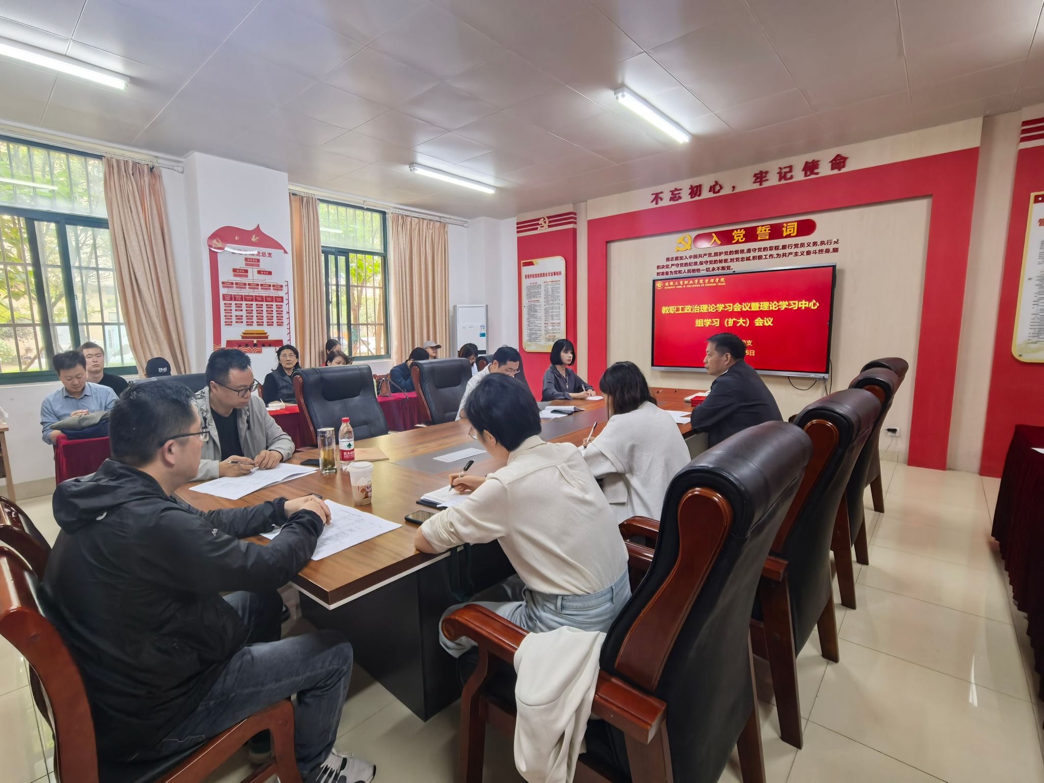 10月15日中午,管理学院党总支召开教职工政治理论学习会议暨理论学习中心组学习(扩大)会议。会议由学院党总支副书记汪锋主持,学院党政领导班子成员、党总支委员、党支部书记、全体教职工参加学习会。