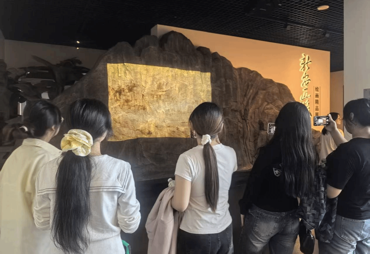 本次考察以“走进非遗现场,感悟匠心传承”为主题,将课堂延伸至博物馆实景中,重点观摩了“徽州三雕”“文房四宝”及“新安画派”等安徽代表性非物质文化遗产项目。同学们在展厅中驻足观摩、热烈讨论,通过实物与图文、场景与多媒体相结合的展示方式,深入了解了徽州雕刻的技艺精髓、文房四宝的制作工艺以及新安画派的艺术风格。