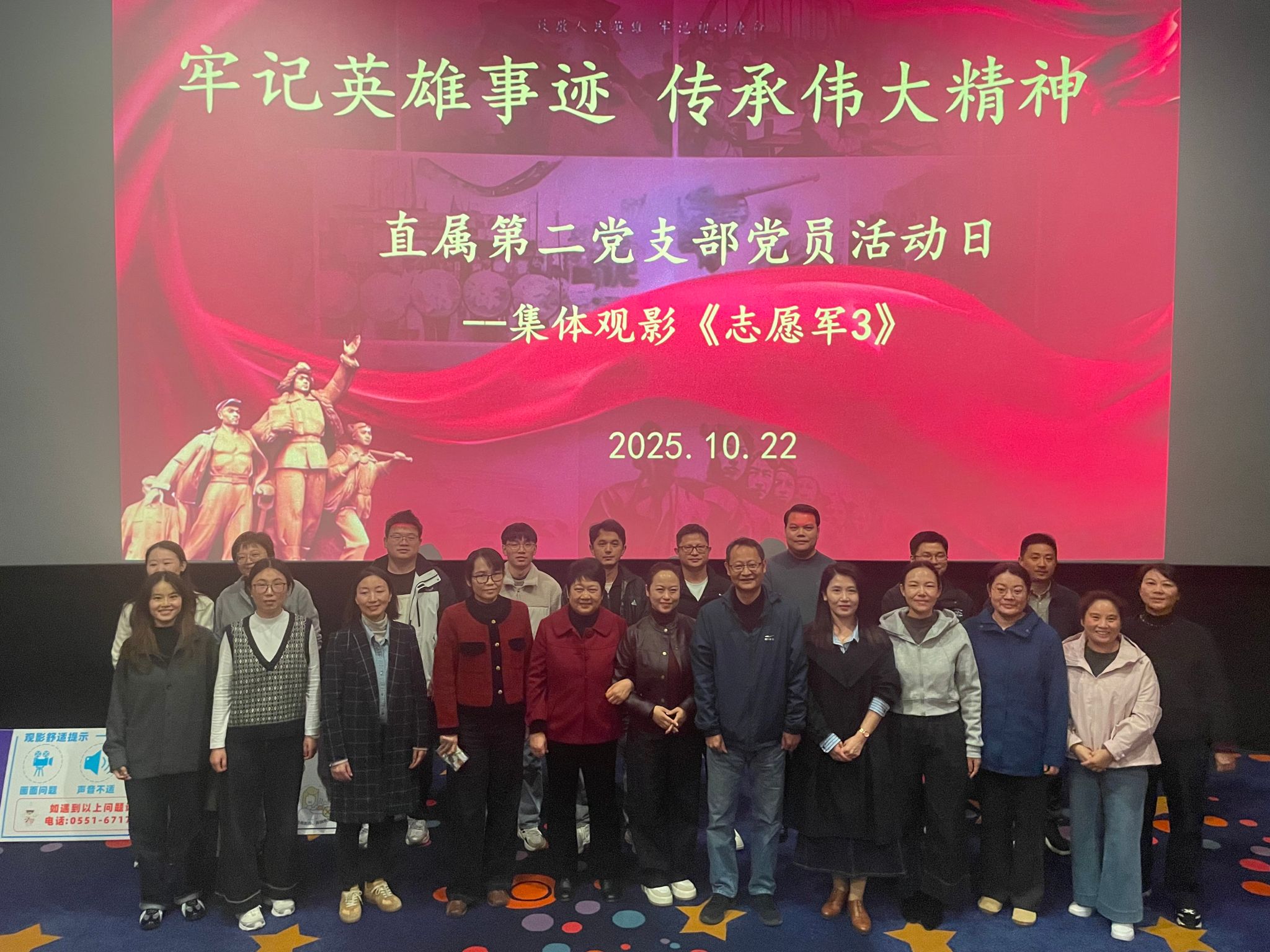 今年正值中国人民志愿军抗美援朝出国作战75周年。为深切缅怀革命先烈,传承伟大抗美援朝精神,10月22日下午,直属第二党支部组织全体教职工集体观看了电影《志愿军3:浴血和平》,在光影交织的历史叙事中,共同感悟初心使命,汲取奋进力量。
