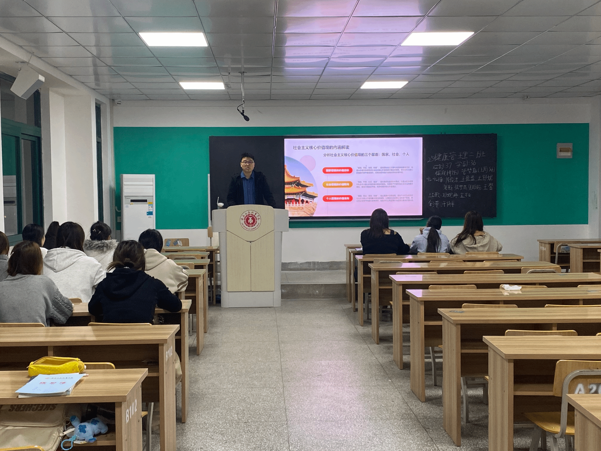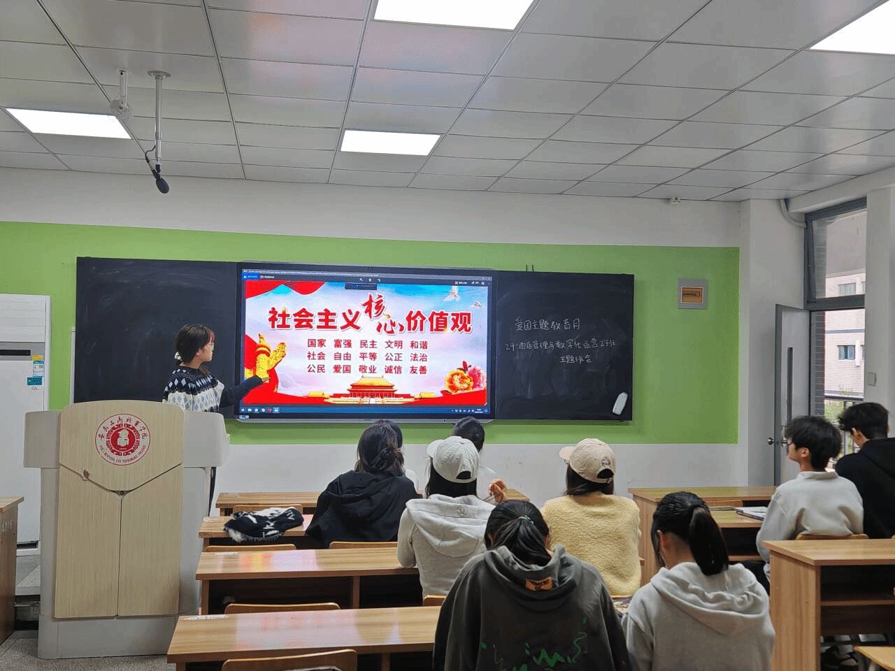 深植核心价值观,凝聚青春正能量:围绕“我与社会主义核心价值观”,班级学生代表走上讲台,结合自身经历,分享了他们对价值准则的理解,在互动中加深了同学们对核心价值观的认知,引导大家将其作为日常行为的基本遵循。
