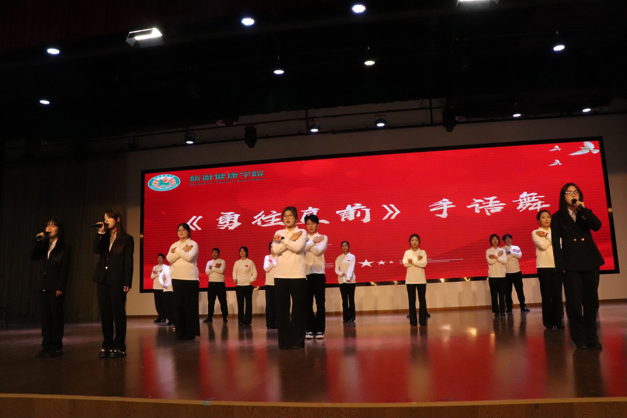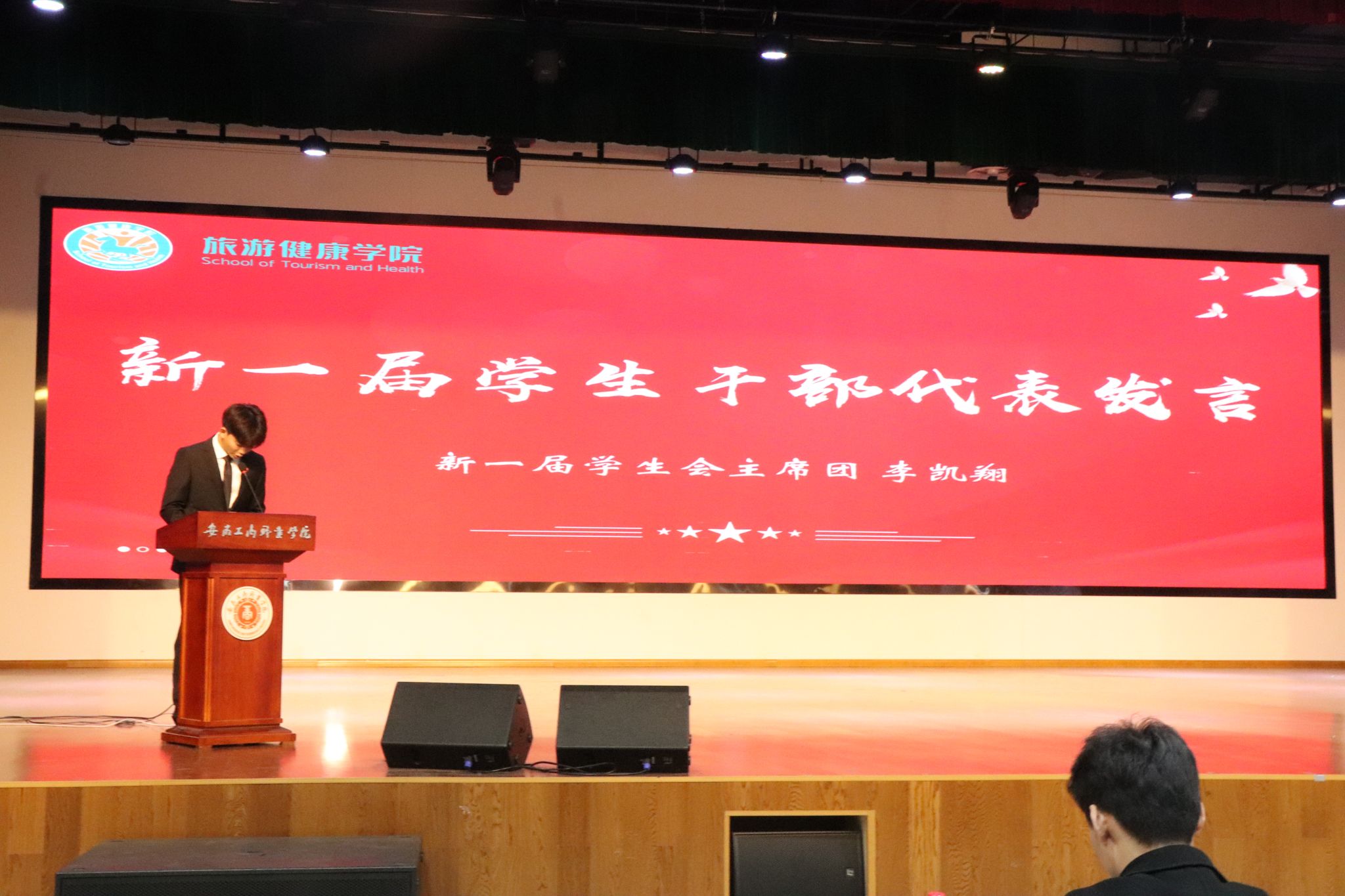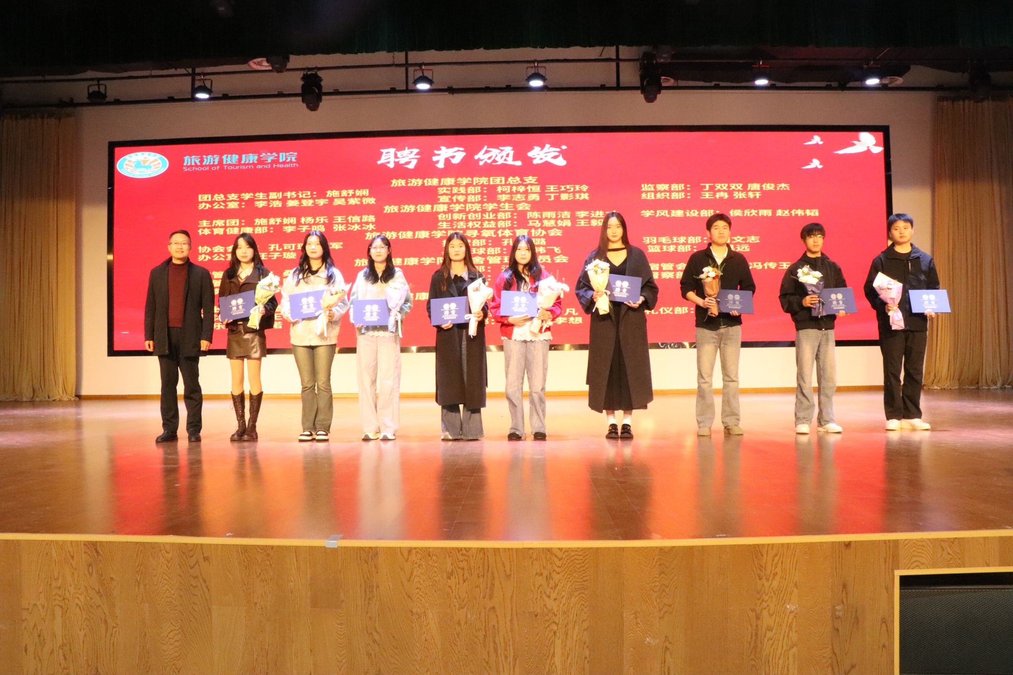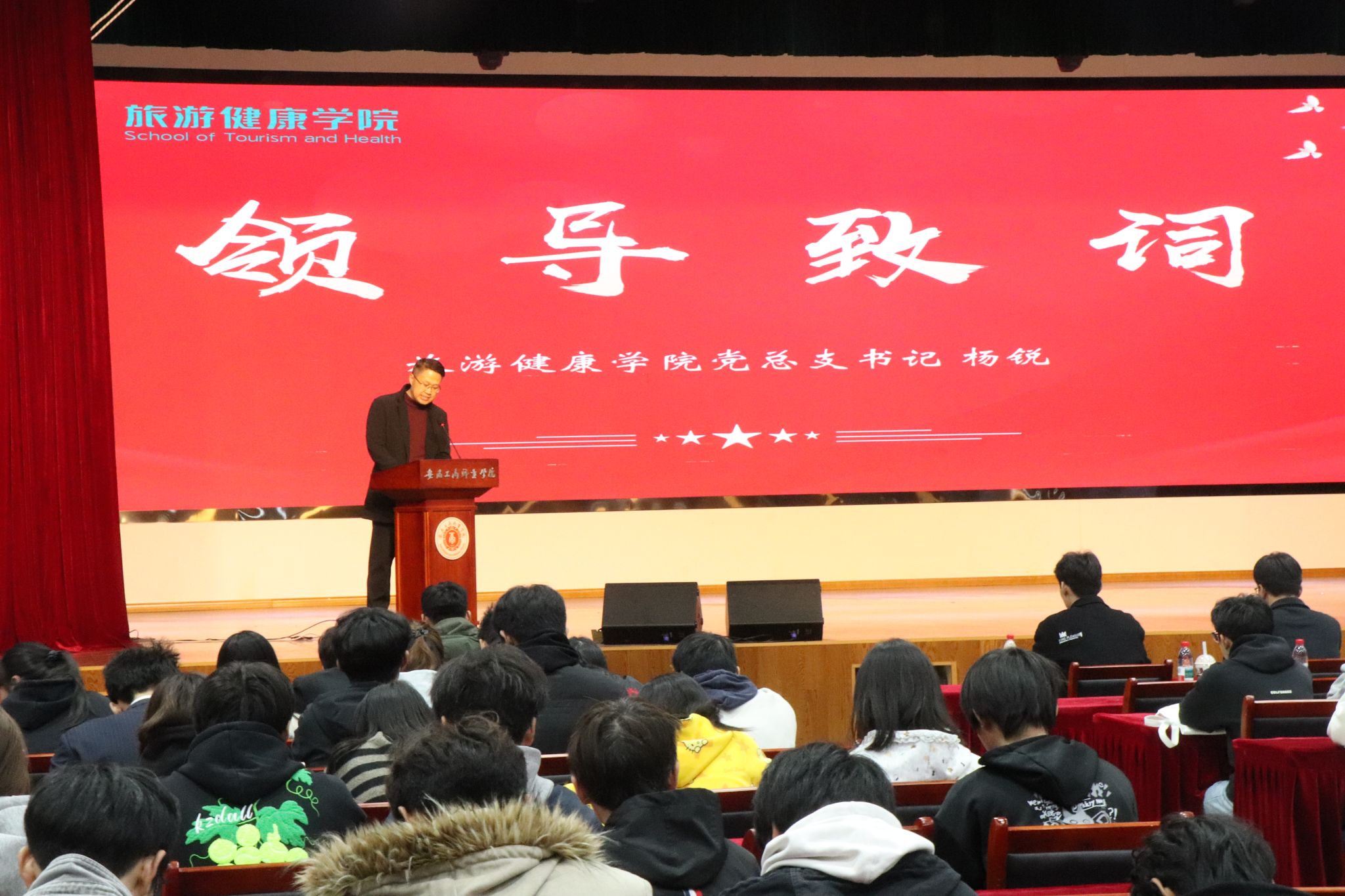 11月12日中午,旅游健康学院在大学生活动中心隆重召开2025年度团学组织换届表彰大会,总结过去一年团学工作成果,表彰先进集体与个人,并完成新一届团学组织骨干的聘任仪式。旅游健康学院党总支书记杨锐、组织员张程程、办公室主任孙群以及团学组织指导老师和辅导员代表出席大会。