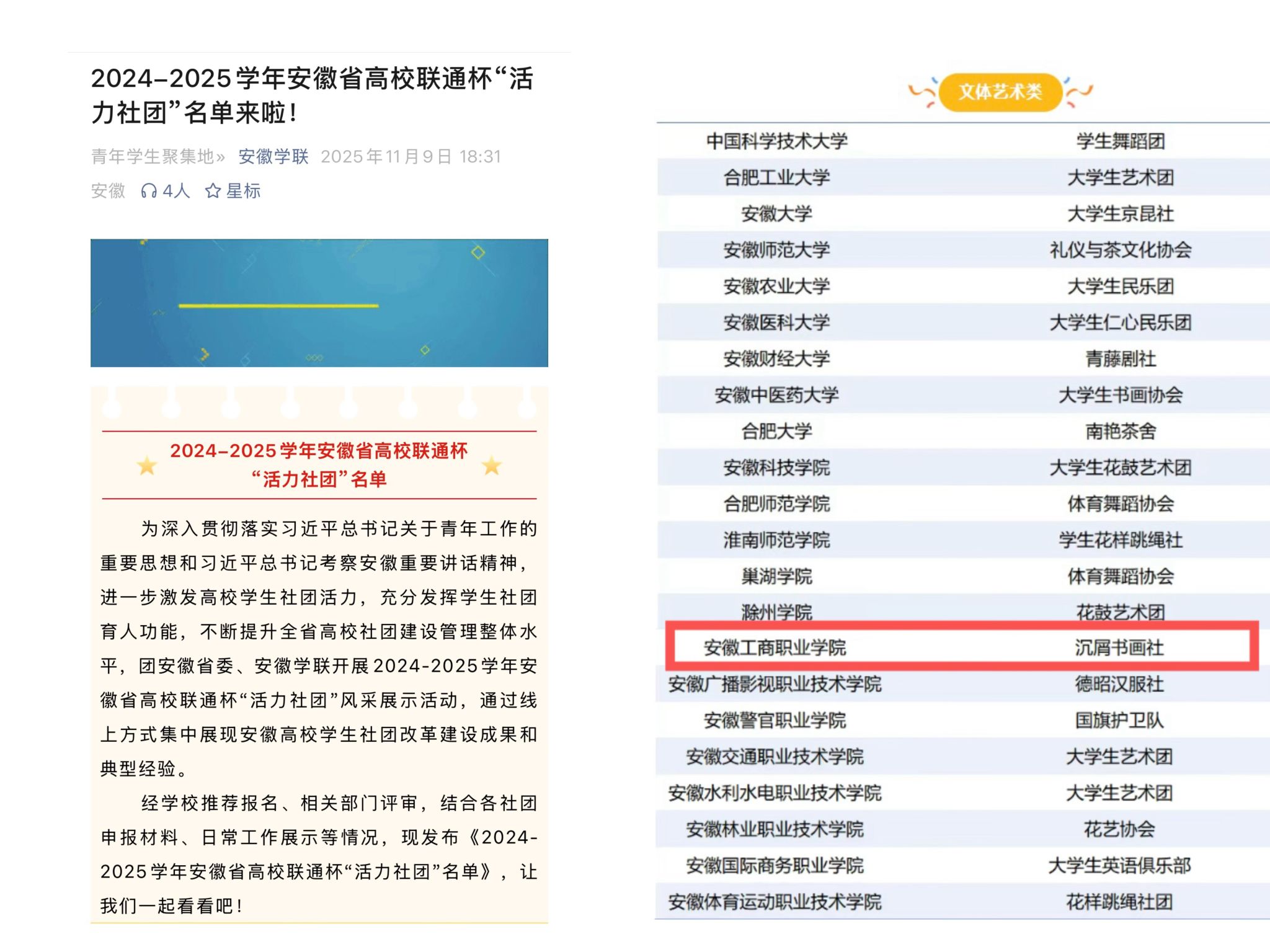 近日,由团安徽省委、安徽省学联开展的2024-2025学年安徽省高校联通杯“活力社团”风采展示活动入选名单公布。经学校推荐报名、相关部门评审,结合各社团申报材料、日常工作展示等情况,世界第一大赌场,澳门金沙城中心:沉屑书画社凭借其扎实的活动基础、鲜明的社团特色和显著的育人成效,成功入选,荣获省级“活力社团”称号。