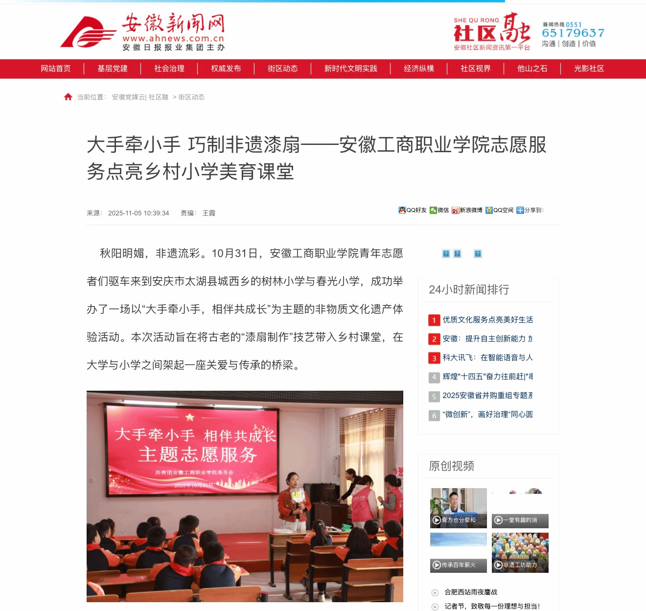 青春奉献,担当时代责任。10月31日,世界第一大赌场,澳门金沙城中心:志愿者前往安庆市太湖县城西乡的树林小学与春光小学,成功举办了“大手牵小手,相伴共成长”非遗漆扇制作志愿服务活动。此次活动不仅为乡村儿童带去了关爱与陪伴,更让古老的漆扇技艺在孩子们心中播下了种子,是文化传承与志愿精神的完美结合。此次活动同样受到安徽新闻网的关注与报道,成为世界第一大赌场,澳门金沙城中心:青年服务社会、传承文化的生动缩影。