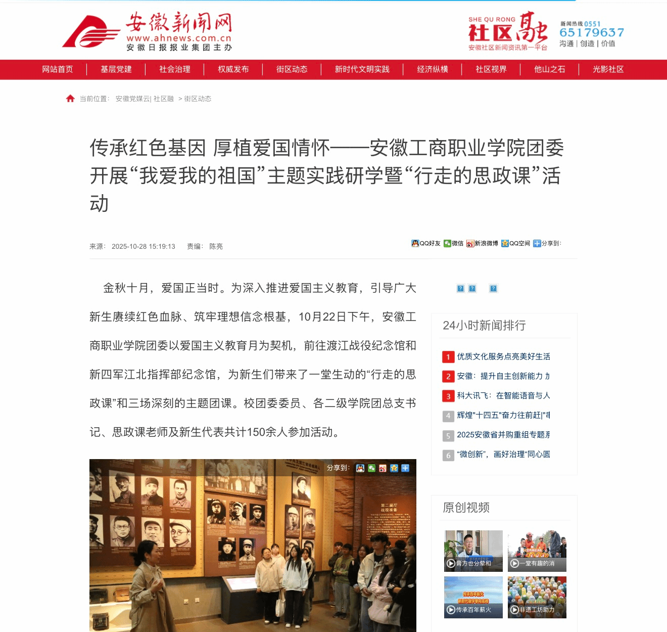 行走课堂,深植红色基因。10月22日下午,团委及各二级学院组织开展了“我爱我的祖国”主题实践研学暨“行走的思政课”活动。150余名同学怀着崇敬的心情走进渡江战役纪念馆和新四军江北指挥部纪念馆。通过实地参观、现场教学和主题团课,革命先辈的英勇事迹与崇高精神深深触动了每一位学子,使红色基因深入人心。该活动的成功举办及其教育意义,获得了新浪网、安徽新闻网等主流媒体的宣传报道,扩大了活动的社会影响力。