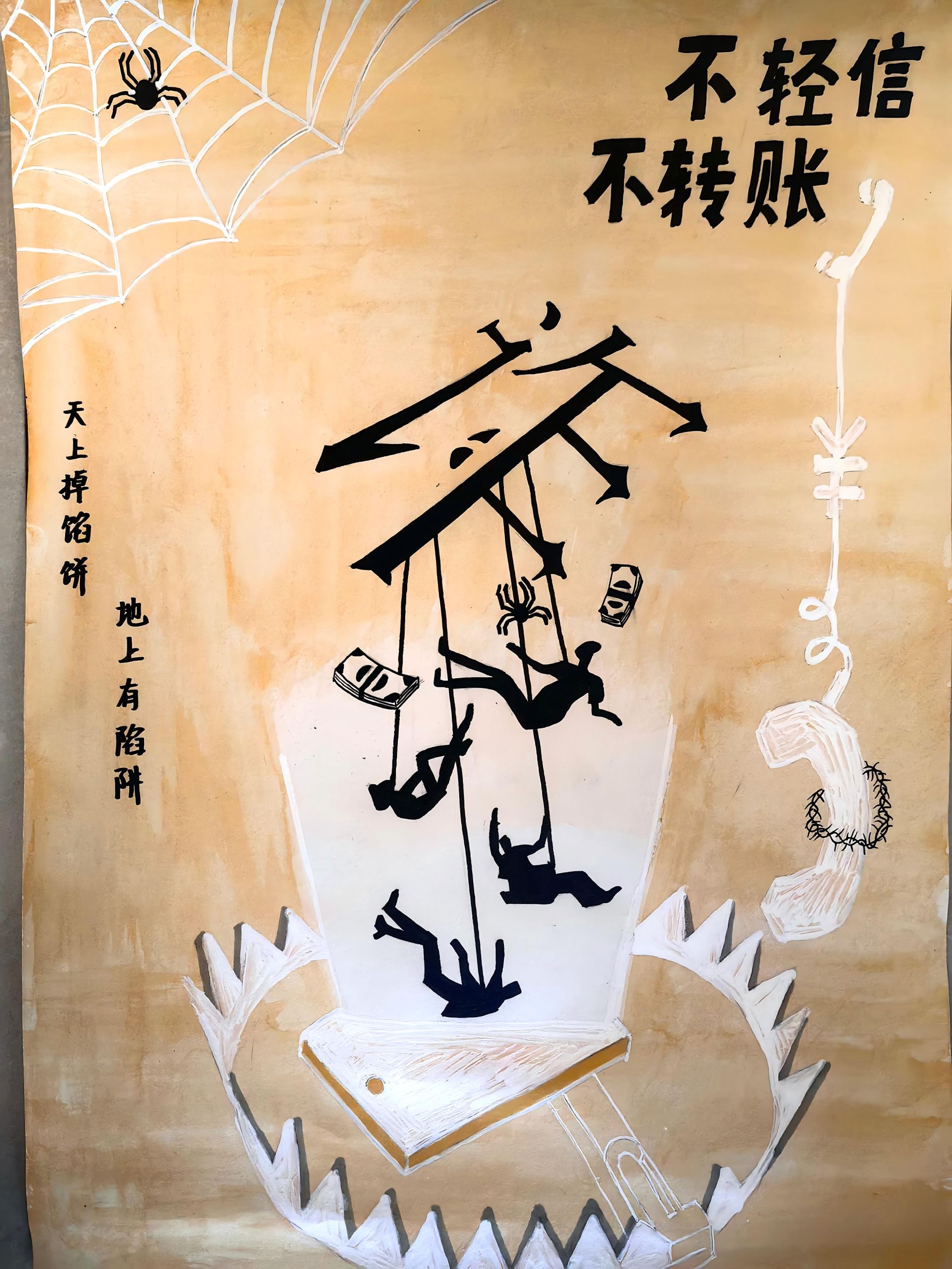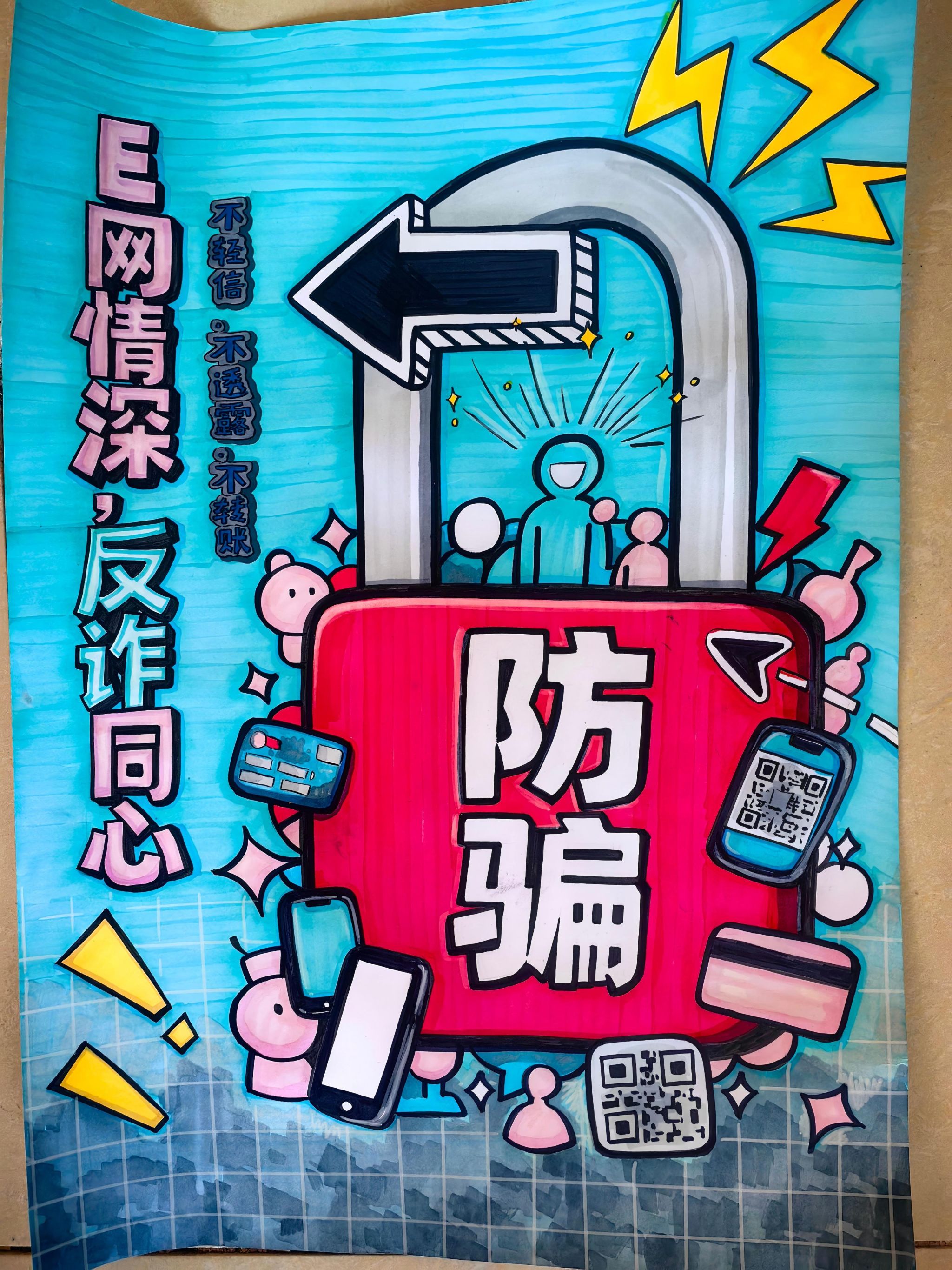 大赛自启动以来,得到了全院学生的热烈响应和积极参与。同学们围绕校园高发的“冒充客服退款”“校园贷陷阱”“虚假兼职刷单” 等诈骗类型,结合生活中听闻的反诈案例与对《中华人民共和国反电信网络诈骗法》的理解,充分发挥想象力与创造力。创作过程中,有的同学以鲜明色彩对比揭露诈骗套路,用夸张漫画形式还原骗子行骗场景;有的同学通过图文结合的方式,清晰标注反诈要点与求助途径;还有的同学融入校园生活元素,让海报既有警示意义又充满青春气息,实现了反诈知识与艺术创意的巧妙融合。活动累计收到参赛作品几十幅,每一幅作品都凝聚着学子们对反诈工作的思考与担当。