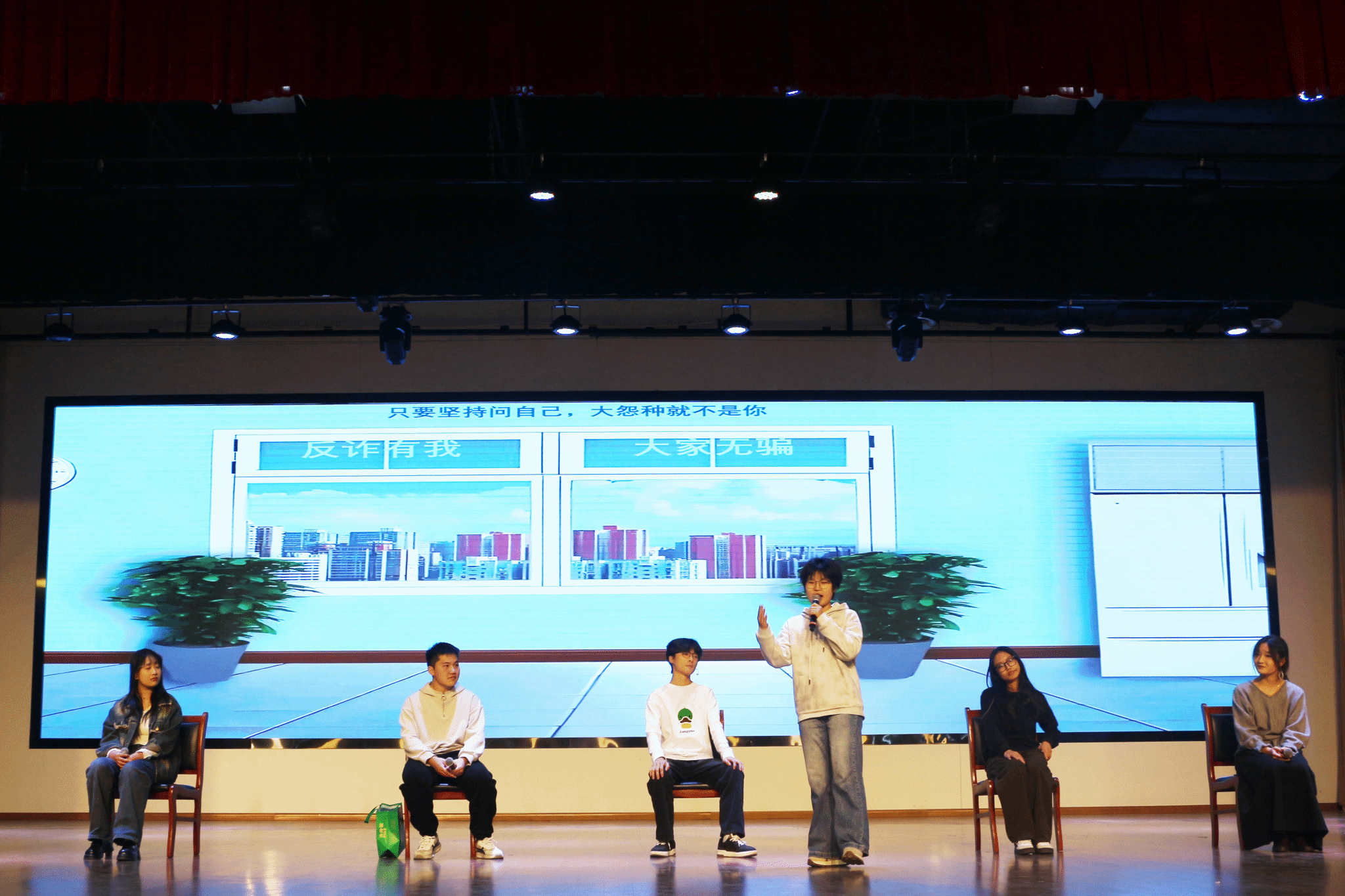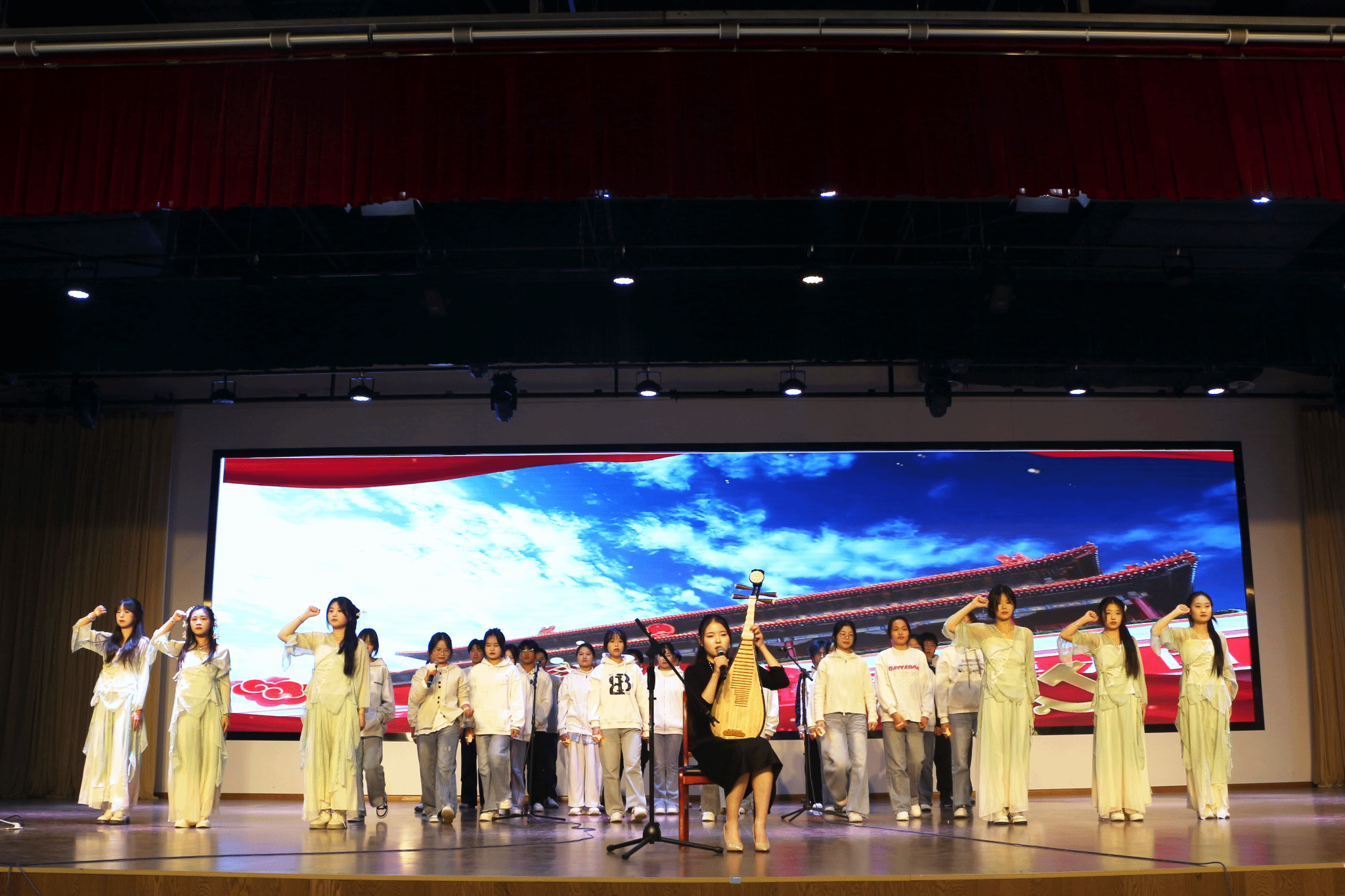 舞台上,25电商9班的舞蹈《笛鸣欢舞》节奏明快、舞姿灵动,用优美的肢体语言传递着青春活力;25物流1班(中外合作)的小品《反诈联盟》紧跟社会热点,以诙谐幽默的表演普及反诈知识,引发全场共鸣;25电商1班的朗诵《朝阳》、25直播2班的朗诵《我和我的祖国》等节目,或激昂澎湃或深情款款,展现了青年学子的家国情怀与理想追求;25物流2班、25营销2班演绎的《相亲相爱》,以舞蹈与合唱的巧妙融合,诠释了班级成员间的深厚情谊;25电商5班的话剧《觉醒年代》重现经典场景,演员们的精彩演绎展现了革命先辈的热血与担当,赢得阵阵掌声;《我们的明天》《青春纪念册》《最美的期待》等合唱节目,各班级用嘹亮的歌声唱出了对未来的憧憬与向往,传递出积极向上的青春正能量。此外,朗诵与歌唱结合的《闪耀吧,青春的火光》等创意节目,更是体现了同学们的巧思与团队协作能力。