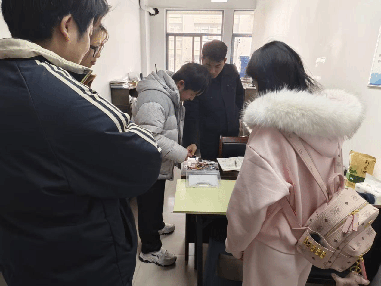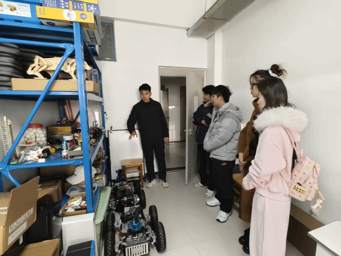 活动现场,校内负责学生向联合培养学生代表展示智能机器人原型、木质机械结构模型、分类零件盒等,详细讲解机器人解动力系统与控制模块的设计逻辑;随后在实验桌前展示电子元件工具箱,演示电路焊接、传感器调试等实操步骤,并邀请学生代表动手参与元件组装。通过动手实操,学生代表直观了解了科创项目从创意构思到成品落地的全流程。