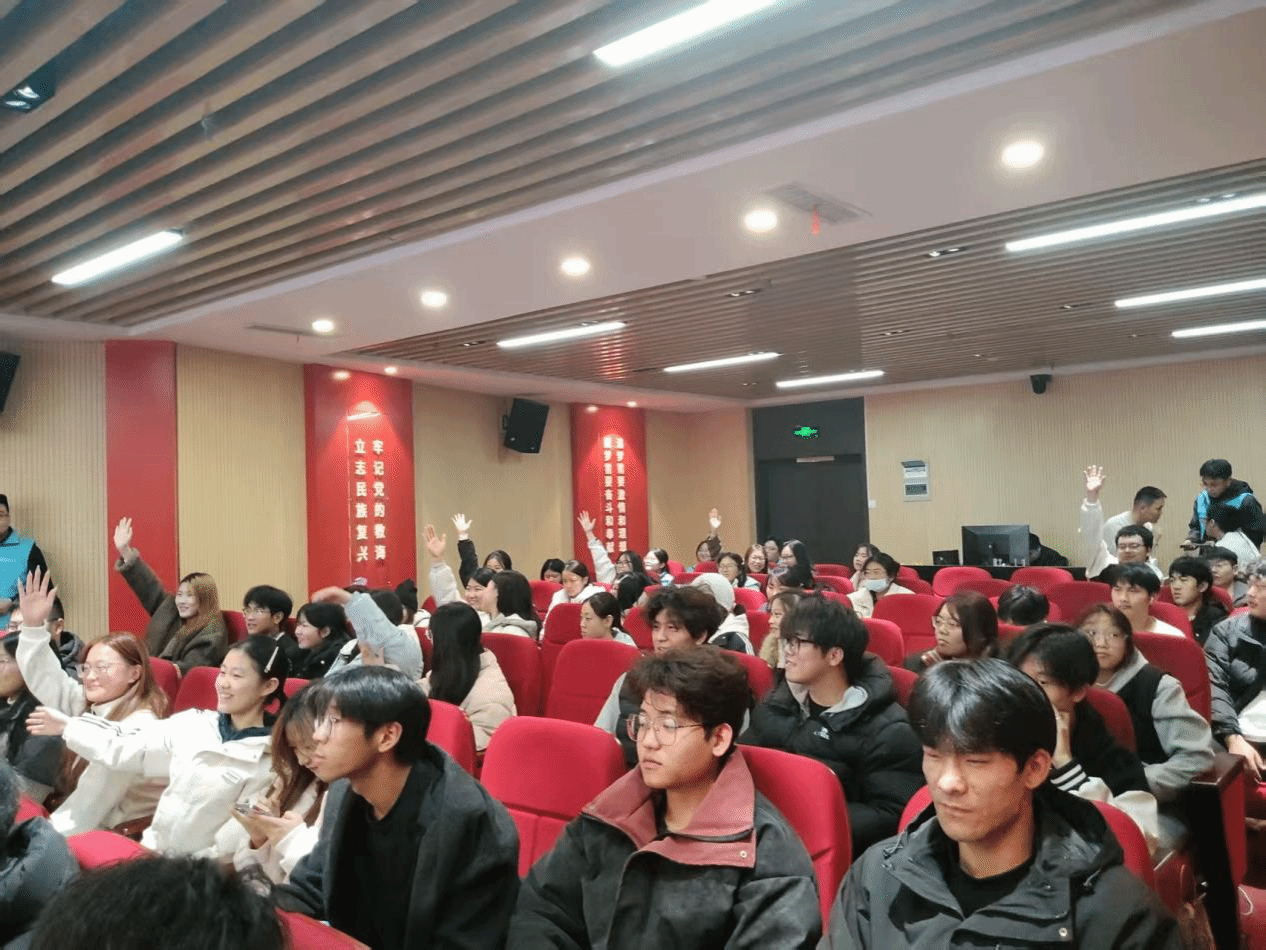 在有奖竞猜环节,现场气氛尤为热烈。宣讲人巧妙设问,引导学生深入了解徽文化中的独特细节。从徽商账簿中使用的商业数字“柴码”到徽州民居家中寓意吉祥的“东瓶西镜”陈设;从体现家族风水智慧的“四水归堂”结构到象征功名德行的牌坊。一个个问题既富知识性又具趣味性,激发了同学们的浓厚兴趣。答对者获赠徽文化主题纪念品,掌声与笑声交织,真正实现“寓教于乐、润物无声”。