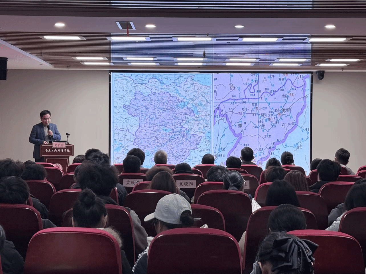 活动分为三大环节,层层递进、环环相扣。首先,安徽大学徽学研究中心副研究员张绪老师作题为《传统徽商文化漫谈》的专题讲座。他以古今徽州地图为引,从地理格局、宗族制度到儒商伦理,系统阐释徽商“贾而好儒、诚信为本、义利兼顾”的精神内核,引导青年学子在历史纵深中感悟中华文化的生命力与时代价值。