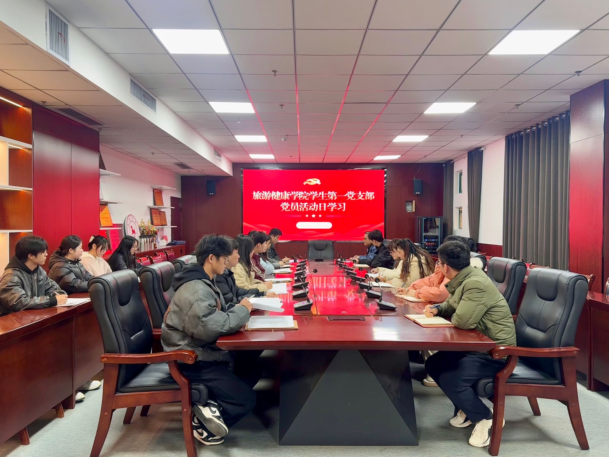 为推动理论学习走深走实,引导支部党员深刻领会党中央最新决策部署,2025年12月17日,旅游健康学院学生第一党支部以“深学细悟强信念 知行合一促发展”为主题开展主题党日活动。活动由支部书记张亚运主持,支部全体师生党员参加。