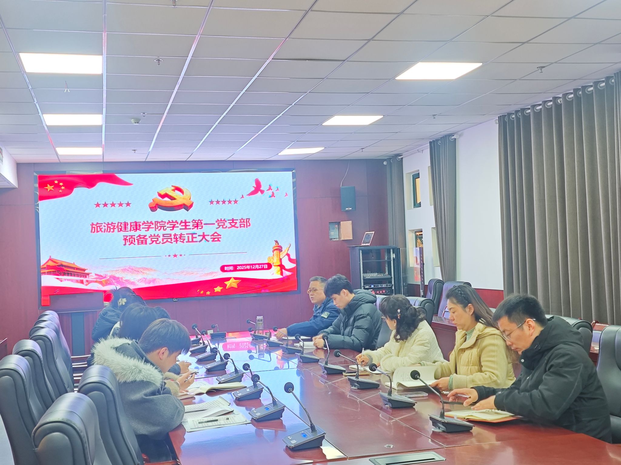 2025年12月27日下午,旅游健康学院学生第一党支部在学院会议室组织召开支部党员大会,讨论杨英等6名预备党员的转正议题。旅游健康学院党总支书记杨锐到会指导,会议由支部书记张亚运主持。