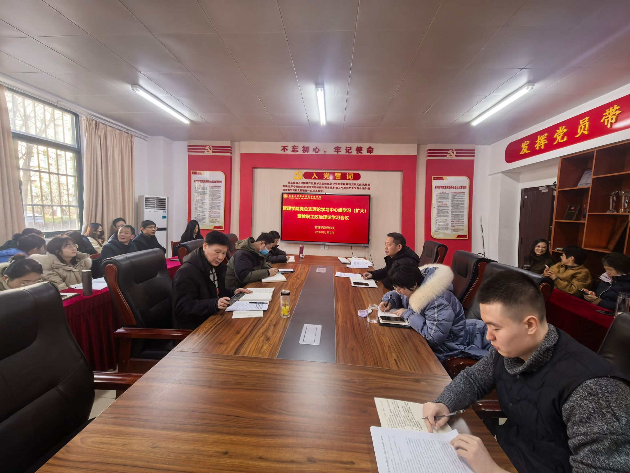 为深入学习贯彻党的创新理论成果,切实以理论武装引领学院教育教学与管理服务高质量发展,1月7日中午,管理学院党总支召开2026年第一次理论学习中心组学习(扩大)会议暨教职工政治理论学习会议。会议集中学习了习近平总书记重要文章《学习好贯彻好党的二十届四中全会精神》及省委十一届十一次全会精神,紧扣“以理论武装凝聚育人共识、以学促干赋能学院发展”核心目标,推动全会精神与学院发展实践深度融合。