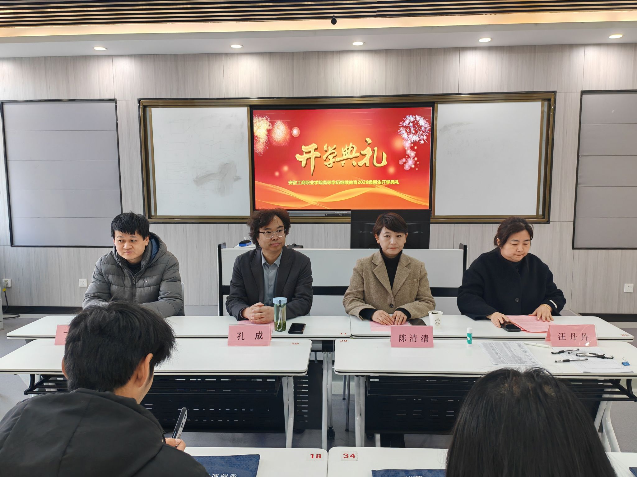 三月春风暖,逐梦正当时,3月14日上午,安徽工商职业学院2026级高等学历继续教育新生开学典礼在庐阳校区举行。本次典礼以“启航新征程,共筑未来梦”为主题,校党委委员、宣传统战部部长孔成,国际交流与继续教育学院副院长陈清清,国际交流与继续教育学院成教科科长丁齐、辅导员汪丹丹及2026级全体新生共同参加。