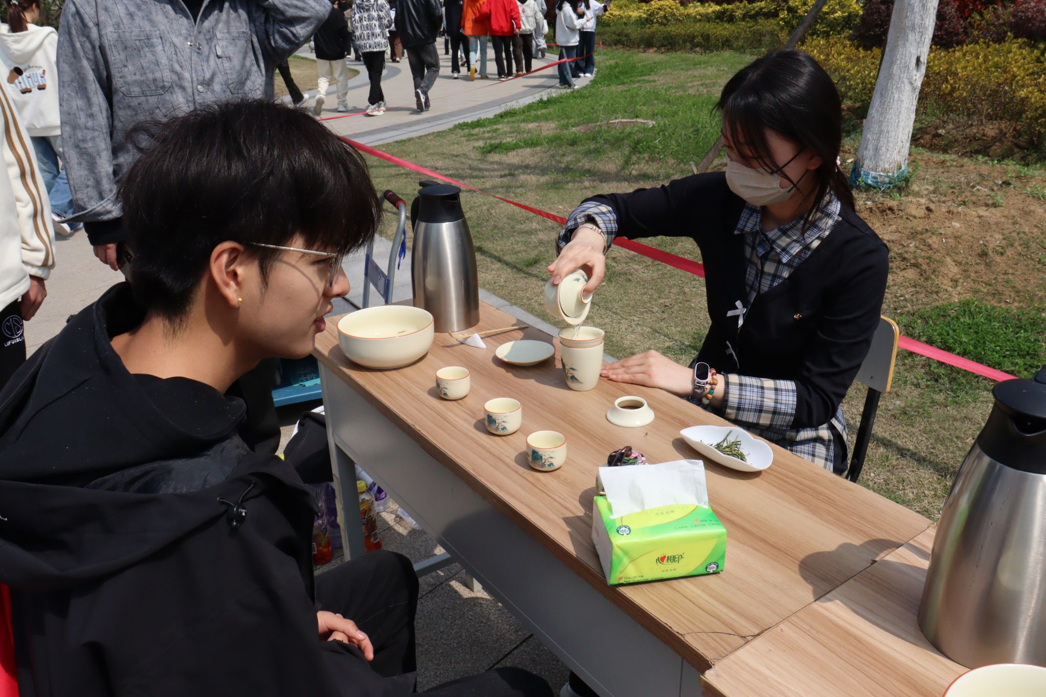 茶艺展示区飘散着袅袅茶香,茶艺师以“凤凰三点头”等手法演绎泡茶礼仪。师生们围坐茶台,品鉴黄山毛峰等名茶,聆听功夫茶艺背后的中式文化。同学们表示将在课余时间设置“爱心茶摊”,为学校的老师、同学、服务人员等敬献热茶,用实际行动诠释“奉献、友爱、互助、进步”的志愿精神。