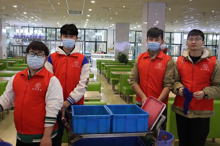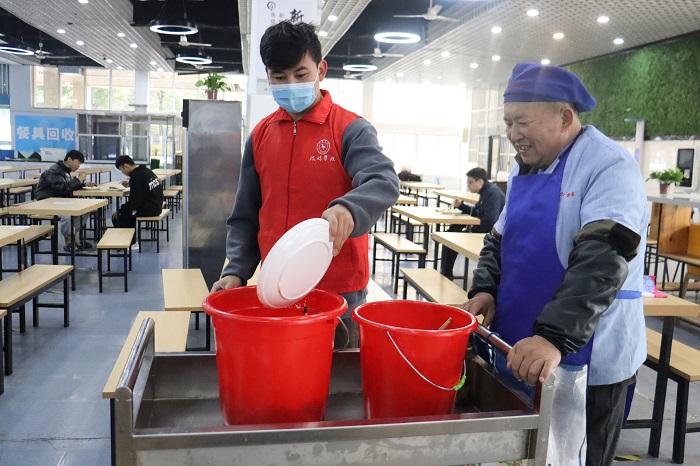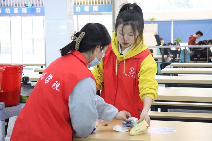 活动期间,志愿者将餐桌上的饭粒、残渣清理到垃圾桶,为下一位吃饭的同学提供干净的桌椅,并帮助食堂阿姨打扫地面上的饭粒、残渣与垃圾,清理卫生死角。与此同时,志愿者们还对同学们就餐过程中出现浪费食物、就餐后餐具随意摆放等不文明行为进行劝导,维护餐厅就餐秩序,营造良好的就餐环境。