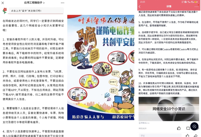 云端发声,推动网络协同育人。应用工程学院以线上线下相结合的方式,深入宣传安全知识,切实将安全教育覆盖到全体学生,确保安全警钟长鸣;充分发挥学院“两微一端”等平台的舆论引导作用,广泛宣传国家安全、公共安全、校园安全、网络安全等安全知识,推动安全教育入脑入心,形成校园安全教育的良好氛围。