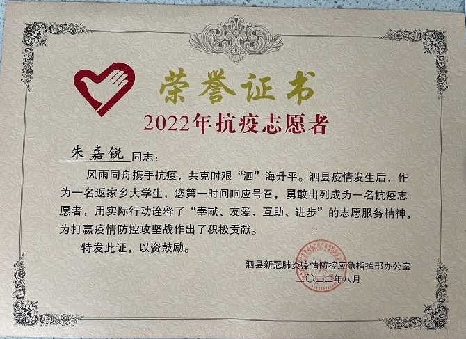 2022年6月,泗县突发新冠肺炎疫情,防控压力骤增,构筑联防联控、群防群控的严密防线刻不容缓,身为返乡大学生的朱嘉锐,关键时刻,面对疫情没有退缩,立即拨打了村委会的联系电话,主动报名成为一名抗疫志愿者,协助村做好防控卡口值班、环境卫生整治、物资配送、核酸采样、防疫知识普及等工作,在疫情防控一线,留下了忙碌的身影,展现了当代大学生的优良品质和担当意识,赢得了家乡人民的肯定和好评。