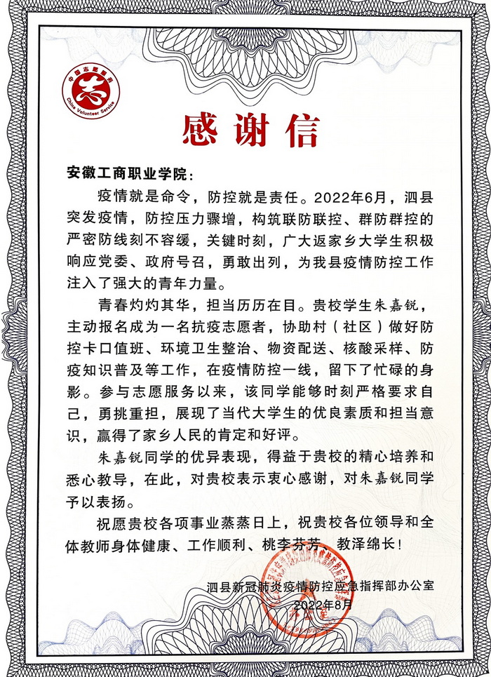 近日,我院收到来自泗县新冠肺炎疫情防控应急指挥部发来的感谢信,感谢我院2021级计算机网络技术专业朱嘉锐同学在泗县抗击疫情一线所做的工作和奉献。