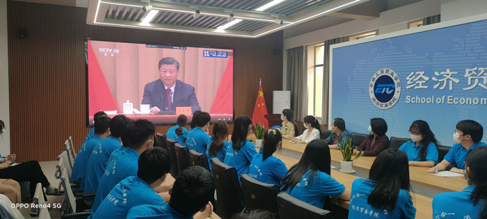 2022年5月10日上午10:00,庆祝中国共产主义青年团100周年大会在北京人民大会堂隆重举行,中共中央总书记、国家主席、中央军委主席习近平发表重要讲话。经济贸易学院党政领导、部分辅导员和学生会骨干、团干、团员代表积极收看大会直播并展开热议。