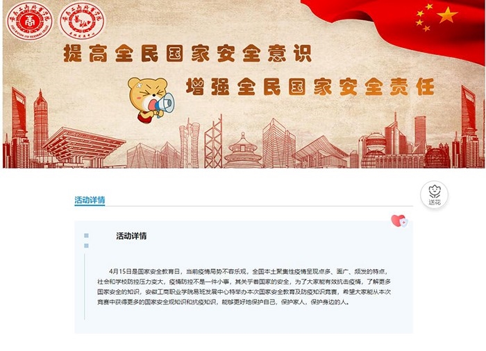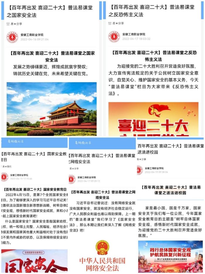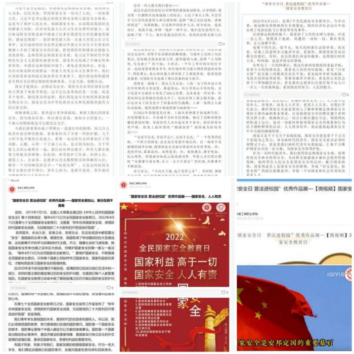 2022年国家安全教育日活动期间,易班发展中心累计发布《国家安全教育日》、《普法易课堂之国家安全法》、《普法易课堂之网络安全法》、《普法易课堂之反恐怖主义法》、《普法易课堂之送法进校园》等多篇推文,普及国家安全法律法规,呼吁广大学生守法爱国。