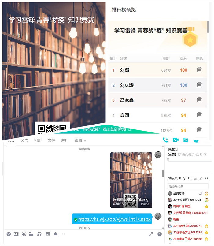 线上知识竞赛 3月27日,在疫情防控的特殊时期,学院改变线下活动的方式,组织“学习雷锋,青春战疫”线上知识竞赛,用知识问答的方式学习雷锋精神、志愿服务、疫情防控等内容,检验学校疫情防控期间规章制度知识点,用责任感和行动力诠释青春正能量。本次活动通过前期在各个班级的宣传,共有两百多名同学参与比赛,显示出同学们学习的热情,也进一步强化了同学们在疫情防控期间通过行动为学校管理贡献力量。
