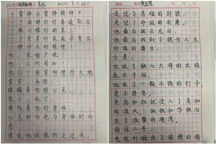 书法是我们中华民族特有的传统艺术,为激发学生对祖国灿烂文化和语言文字的热爱之情,3月23日,团总支学生会宣传部结合“青春志愿行-雷锋月”主题系列教育活动,组织开展“书写雷锋名言,弘扬雷锋精神”硬笔书法比赛。同学们通过收集整理雷锋生平事迹、雷锋故事、雷锋名言警句等资料,进一步了解雷锋其人,熟悉雷锋事迹,理解雷锋精神的时代内涵,让雷锋精神走进每个人的心灵。活动中所有参赛选手以抄写雷锋日记,雷锋名言等形式进行,不限制书写字体格式,充分发挥同学们的书写能力,所写作品笔画流畅,横平竖直,结构匀称,整体美观。