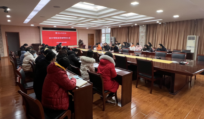 2022年2月18日,会计学院在明德楼二楼2号会议室召开会计学院全体辅导员大会。会议由党总支副书记杨锐主持,院长高克智和全体专兼职辅导员参加了会议。