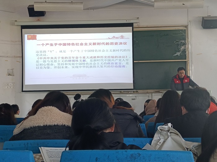 为深入学习宣传贯彻党的十九届六中全会精神,推进学习践行习近平新时代中国特色社会主义思想。根据学院党委相关要求,12月27日中午,旅游学院党总支书记边昊,在学校教学楼六号多媒体教室为学院近200名学生讲授了一堂《形势与政策》课。