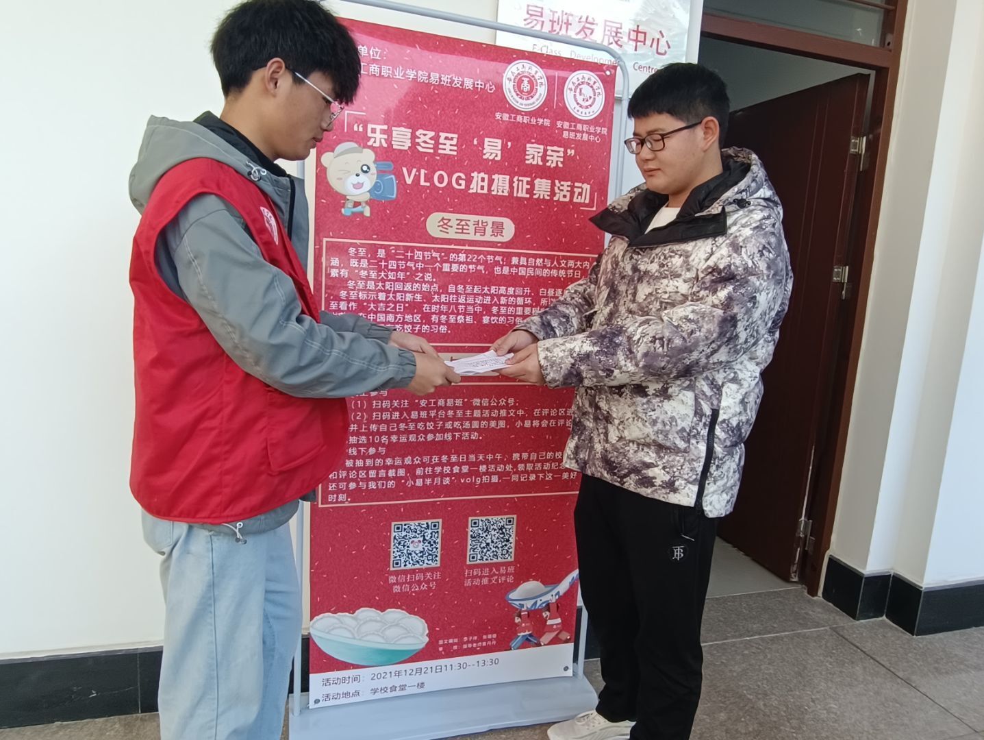 为弘扬中华民族文化,振兴中国传统节日,2021年12月21日,易班发展中心开展了“乐享冬至‘易’家亲”vlog拍摄征集活动。本次活动采用了线上线下相结合的方式。线上活动邀请全体师生在易班平台的活动推文评论区留言,留言内容包括:节日祝福、吃饺子、吃汤圆的花絮图片等。线下活动中,易班发展中心随机抽取10名幸运同学,邀请同学们来易班发展中心,参与“乐享冬至‘易’家亲”vlog拍摄活动。俗话说:“冬至不端饺子碗,冻掉耳朵没人管”。易班发展中心学生助理贴心准备水饺,赠送给幸运同学,祝愿在校生过一个温暖的冬至。