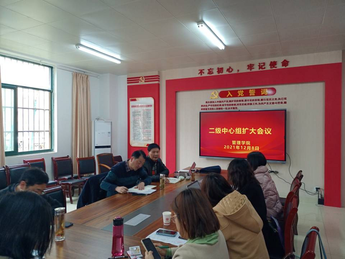 为深入学习宣传贯彻党的十九届六中全会精神,按照学校党委部署和“党员活动日”安排,12月8日,管理学院党总支于党员活动室召开二级中心组学习扩大会议,会议由管理学院党总支书记曹大友主持,学院党总支委员、各党支部书记、教研室主任、专业负责人、全体辅导员和行政人员参加了本次会议。