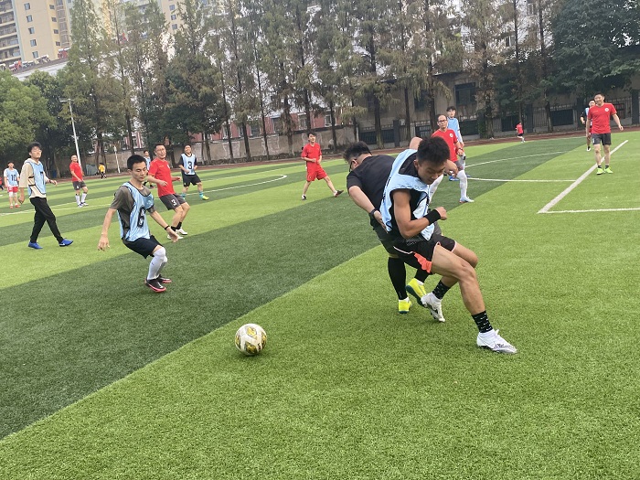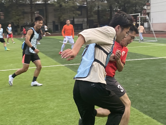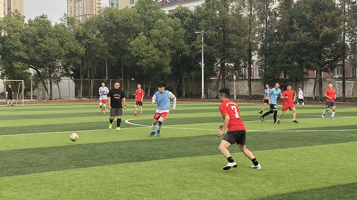 比赛伊始,双方都踢得比较保守,处于试探性阶段。随着双方球风的熟悉,比赛开始激烈起来,双方球员也渐入佳境,不时打出精妙的配合和有威胁的射门。教师队的胡亚东老师脚下功夫了得,无论是抢球,传踢,表现出与平常截然不同的气质。比赛焦灼,双方你来我往,攻守兼备,每个人都将自己融入到整个团队中,充分享受到了竞技体育的乐趣。