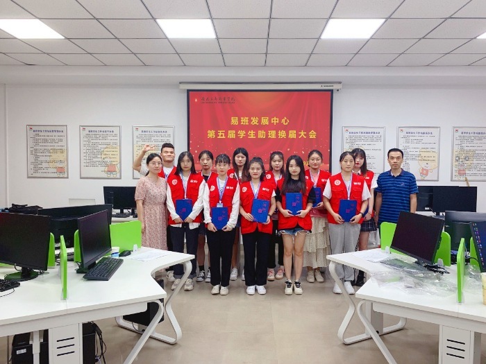 2021年9月28日17:00,易班发展中心召开第五届学生助理换届大会,参加大会的人员有指导老师陈周付、袁丹丹以及全体学生助理。