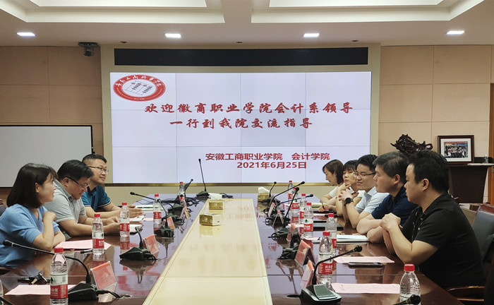 2021年6月25日下午,徽商职业学院会计系党总支书记刘畅、会计系主任陆培中一行八人到安徽工商职业学院会计学院考察交流。出席交流会的有会计学院院长高克智、教务科科长费玄淑、工程管理教研室党支部书记亓萌、财务管理教研室主任谷小城等,会议由党总支副书记杨锐主持。
