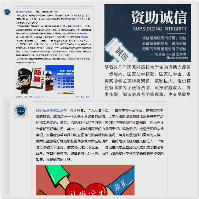 5月至6月学生资助诚信教育主题月中,经济贸易学院采用“互联网+诚信”宣传模式,通过学院QQ和微信的公众号,定期推送诚信主题教育图片、诚信故事,采用学生喜欢的方式和感兴趣的内容,寓教于乐,便于学生即时查看并参与互动。