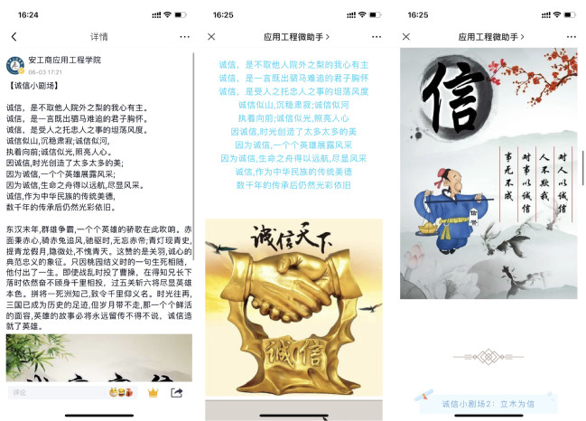 该院以宣传片为切入点,通过搭建多媒体平台,一方面宣传国家助学贷款等资助信息,普及征信、金融等相关知识,让学生们在了解国家助学贷款政策的同时,牢记诚信可贵,珍惜个人信用,增强法律意识。另一方面,通过中华美德故事《宋濂守信》和诚信考试公益微电影《信心》,让同学深刻地认识到“人无信而不立,业无信而不兴”。 为使广大学子积极参加到诚信教育活动中,学院开展了“诚信主题月”征文活动。征文以“诚信感恩”为主题,为广大学子提供了平台,大家积极响应,踊跃投稿。活动强化了对学生们核心价值观念的培养,沉淀了对于诚信的价值的思考,营造了文明守信的文化氛围。