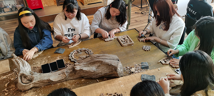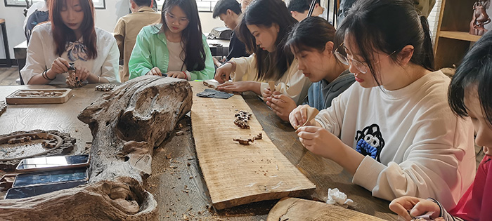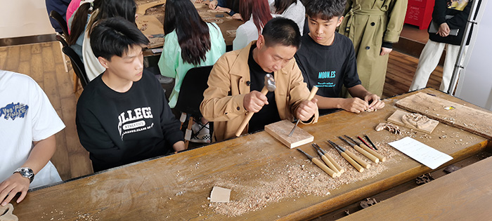 通过四天的大师工作坊实践体验,同学们在汪德洪大师的指导下,深入学习了徽派木雕的历史知识,雕刻技艺和雕刻示范,并且通过观摩学习和动手操作,亲身体验了木雕的过程。汪德洪大师手把手辅导同学们雕刻了多种主题的木雕作品,既有花鸟虫鱼,也有缠枝花卉,在精心的示范与指导过程中,也向同学们展示了大师严谨细致的工匠精神。