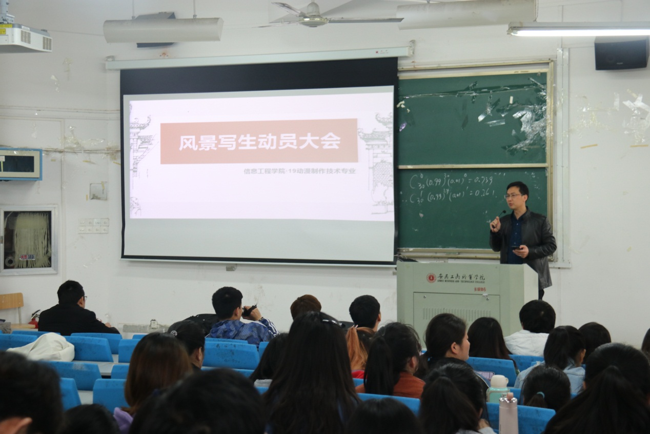4月7日中午,我院19动漫制作技术专业在双凤校区召开风景写生动员大会。信息工程学院范生万院长、教务科科长黄梅娟、风景写生教学团队老师以及19动漫制作技术专业全体学生参加了会议。动员大会由康文慧老师主持召开。