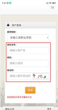 访问安徽工商职业学院网上报名系统,凭身份证号、密码(初始密码为考生号最后六位)和验证码登录报名系统。